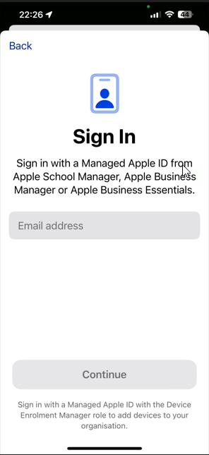 Sign in with your apple id you used for Apple Business Manager and fill in the MFA code.