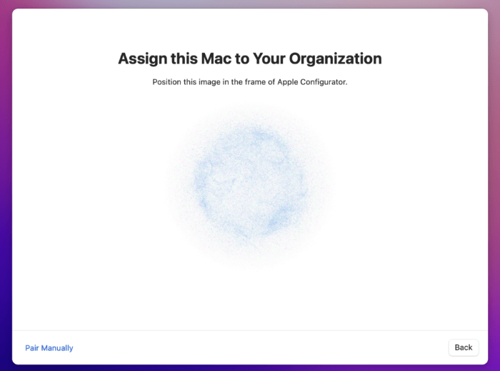 Section titled “Add your MacOS device to Apple Business Manager with Apple Configurator (iPhone)”Hold your iPhone with Apple Configurator open close to the Mac. You should see a screen that says “Assign this Mac to your Organization”.