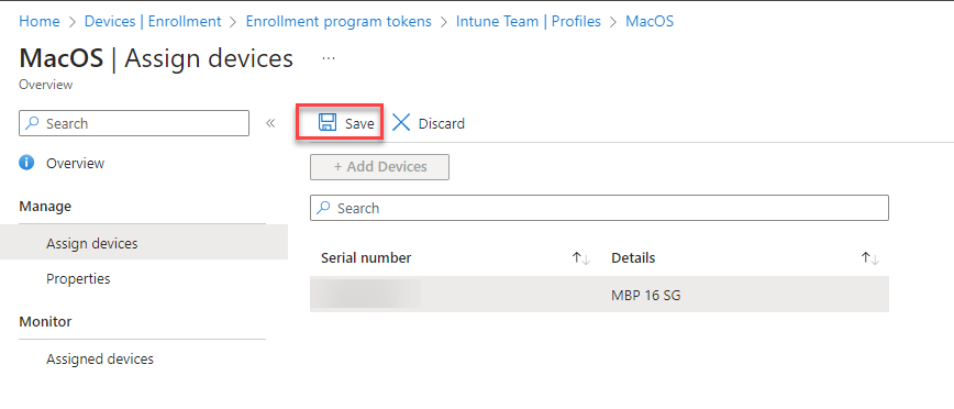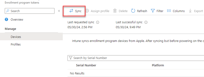 Section titled “Sync Apple Business Manager device to Intune”Now go back to the Intune portal – Devices – enrollment – Apple – Enrollment program tokens – click on your token name – click devices – click sync.
